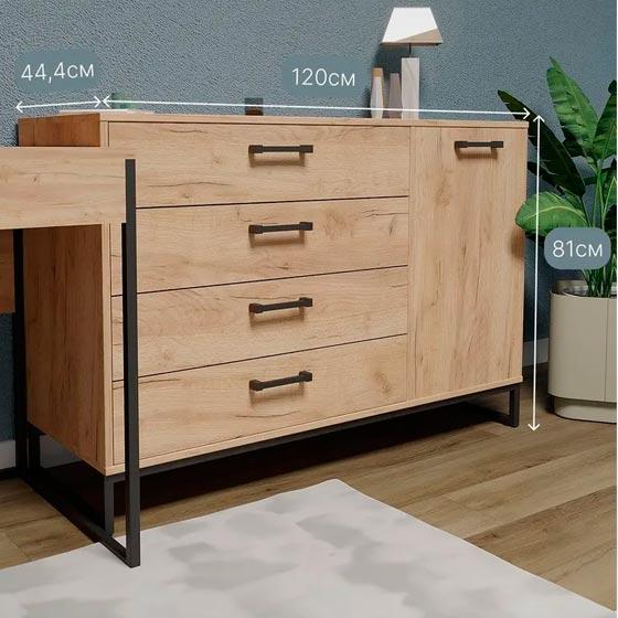 Способы оплаты Способы доставкиКомод закрытого типа, выполнен из ламинированного древесно-стружечного материала (ДСП). Конструкция комода включает четыре выдвижных ящика и один ящик с дверцей, обеспечивающей доступ к внутреннему пространству. Основание комода изготовлено из металла, окрашенного в черный цвет, что придает изделию современный и стильный внешний вид.
