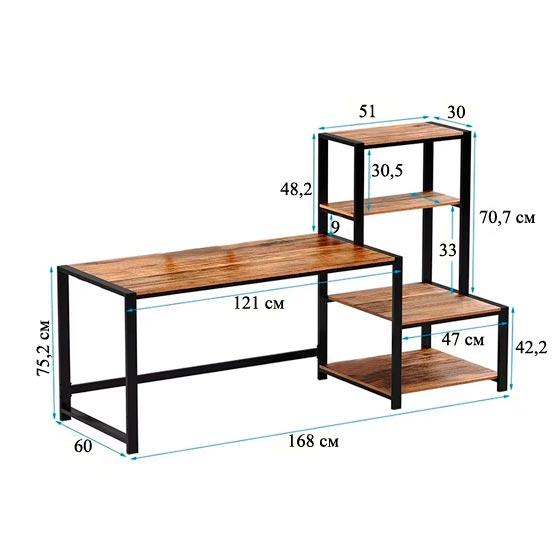Способы оплаты Способы доставкиСтол-стеллаж для дома и офиса выполнен из цельно сваренного каркаса. Каркас изготовлен из металлической профильной трубы с порошковым покрытием. Стеллаж сбоку письменного стола обладает открытыми полками разных размеров, основания которых выполнено из ЛДСП, как и столешница изделия.