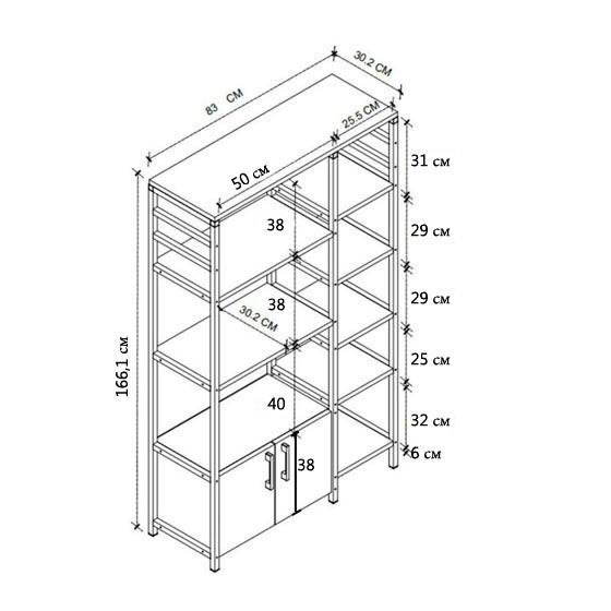 Способы оплаты Способы доставкиШирокий напольный стеллаж для кухни. С одной стороны изделие имеет небольшими полками открытого типа, которые располагаются по всей высоте стеллажа. С другой стороны располагаются более длинные полки открытого типа, а также закрытый створчатый ящик.