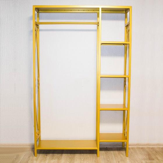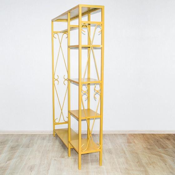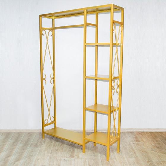 Способы оплаты Способы доставкиОригинальная напольная вешалка открытого типа, с завитками по бокам. С одной стороны расположены полочки, основание каждой из которых выполнено из металла. Весь корпус имеет покрытие золотого цвета, но можно изготовить в любом другом.
